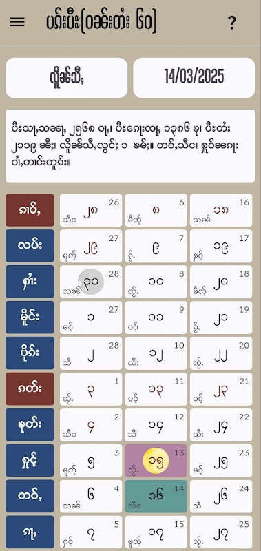 Anda juga dapat menonton hari libur (ဝၼ်းလိုဝ်ႈၸႂ်) yang terlibat dalam aplikasi ini. Anda bahkan bisa melewati tahun ke tahun di dalamnya.