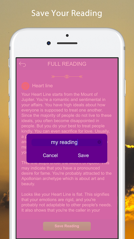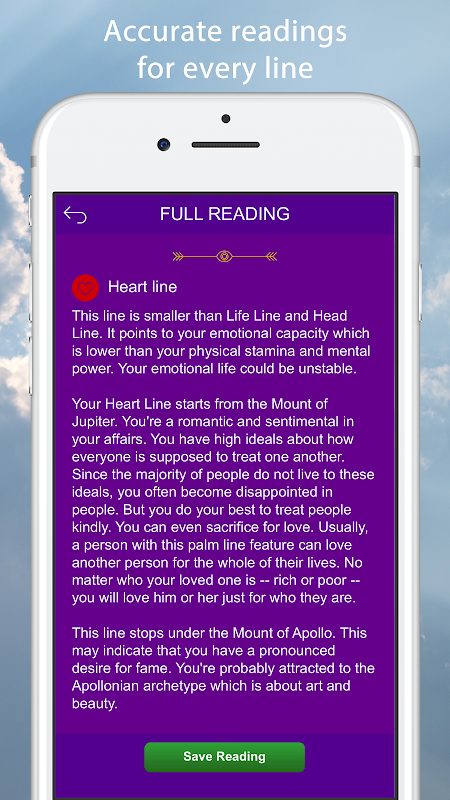 Reveal the life story written on your palm! Your palm lines contain a story about your personality, your traits and perceptions. Our palm reading app -- Palm Reading Insights -- will help you reveal your hidden story. Palm Reading Insights reads your palm to find and analyse your Heart Line, Life Line, Head Line, Fate Line and all the palm mounts. Get a free and personalised reading of your palm based on the ancient palm reading rules.