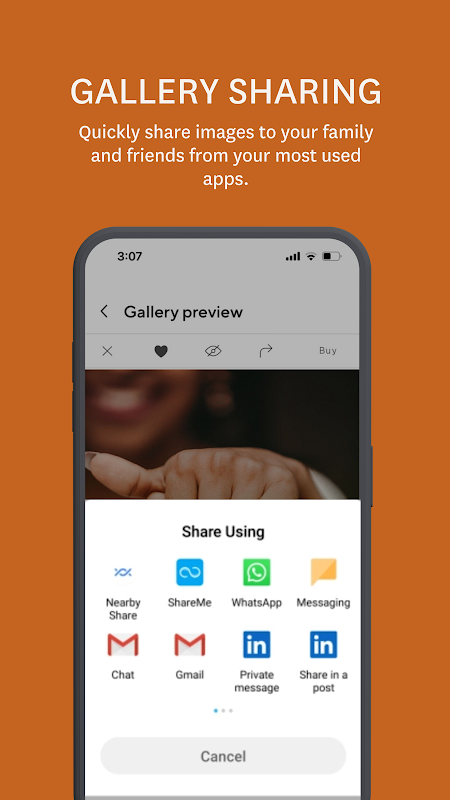 Antarmuka kami yang ramah pengguna memastikan pengalaman yang mudah. Hanya dengan beberapa klik, Anda dapat dengan mudah mengunduh gambar satu per satu, pilihan favorit, atau keseluruhan galeri Anda. Berbagi disederhanakan melalui opsi bawaan di ponsel Anda, memungkinkan Anda dengan mudah mengirim galeri Anda ke teman dan keluarga atau berbagi foto Anda di berbagai platform media sosial.