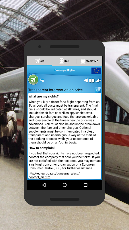 Passenger Rights gives clear and concise information on travel rights in the European Union. The question/answer format makes it easy for you to identify the problem you're having and get a clear explanation of your rights concerning that problem, and the options available to you.