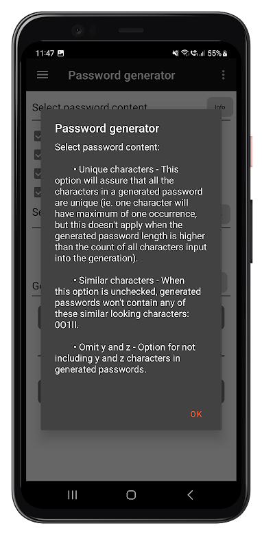 Anda diberi opsi untuk memilih karakter mana yang harus berisi kata sandi Anda. Membuat kata sandi dengan Pembuat Kata Sandi cepat dan mudah, cukup periksa opsi Anda dan tekan tombol.