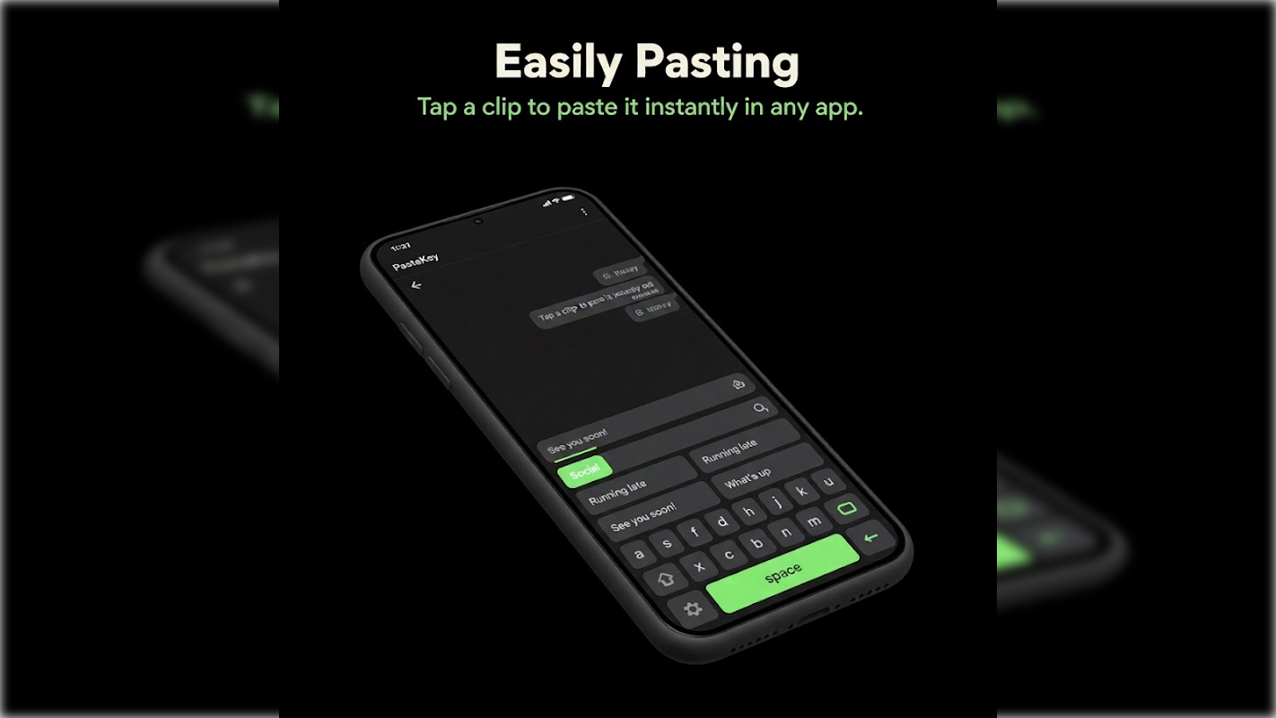 PasteKey memungkinkan Anda menyimpan cuplikan teks dan menempelkannya secara instan menggunakan keyboard Tempel Otomatis. Tidak perlu menyalin. Tidak perlu beralih aplikasi. Cukup ketuk dan tempel.