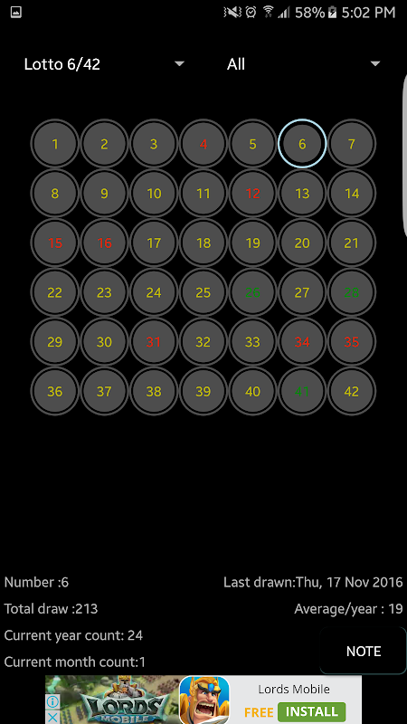 Lihat statistik setiap nomor untuk Lotto 6/42, mega Lotto 6/45, Super Lotto 6/49, Grand Lotto 6/55, Ultra Lotto 6/58