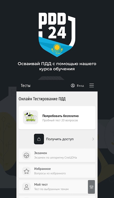 PDD24 adalah aplikasi Keselamatan Mengemudi resmi yang dikembangkan oleh perusahaan yang berspesialisasi dalam soal-soal ujian tentang peraturan lalu lintas Republik Kazakhstan.