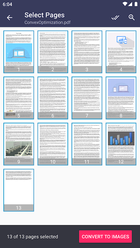 PDF to Image Converter automatically scan all the pdf files on your device. You can choose a PDF from the list or select the PDF you want to convert from any file manager and open it with this application.