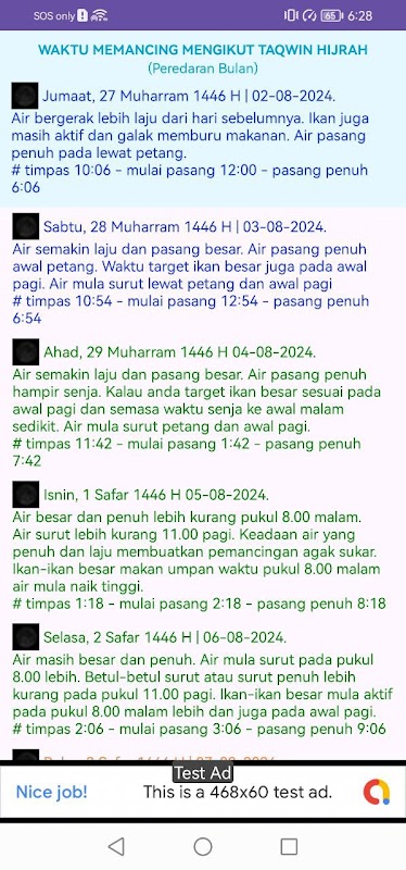 Dengan Pedoman Penangkapan Ikan, pengguna dapat menentukan hari terbaik untuk memancing dalam sebulan berdasarkan kalender bulan. Ini memberikan informasi tentang siklus bulan, membantu pengguna merencanakan perjalanan memancing mereka secara tepat. Selain itu, aplikasi ini menawarkan informasi pasang surut berdasarkan astronomi samudera, menunjukkan waktu memancing yang paling cocok mulai dari pasang tinggi hingga purnama.