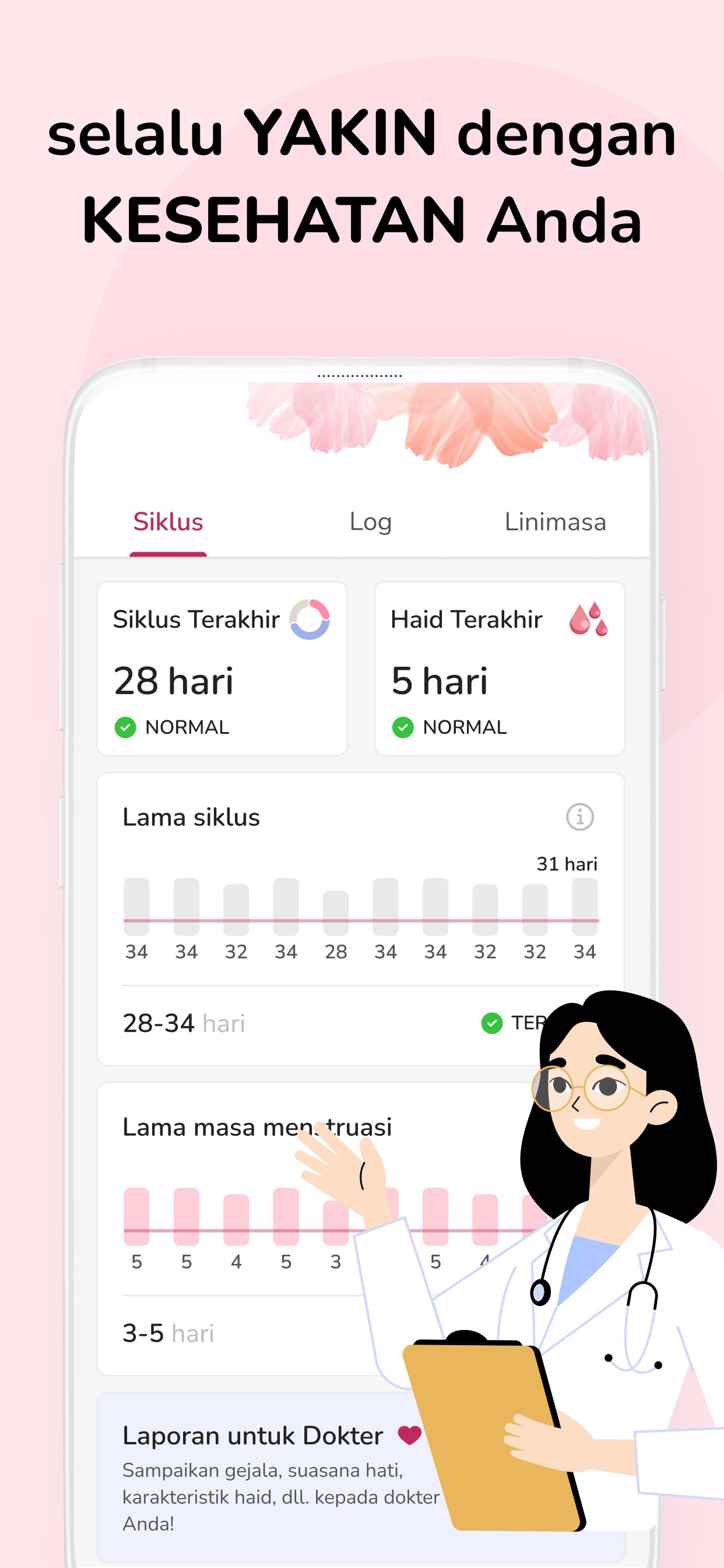 - interval prediksi siklus menstruasi yang dapat disesuaikan, baku, dan rata-rata yang tersedia pada bagian pengaturan