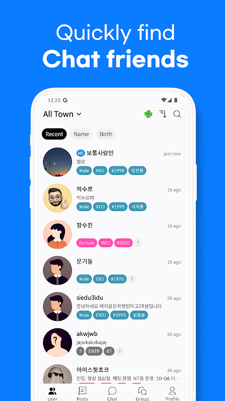Nikmati obrolan 1:1, obrolan acak, obrolan suara, komunitas, tes kepribadian, tes teman, dll. dengan pengguna dari seluruh dunia berdasarkan Kepribadian, usia, jenis kelamin, dan lingkungan.