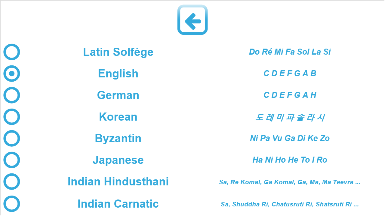 - Choice of language among 8 notation systems for the displayed name of the note to play on the 4 octaves piano keyboard : Latin Si, English B, German H, Korean, Byzantine Zo, Japanese Ro, Indian (Hindusthani) Ni, Indian (Carnatic) Kakali Ni