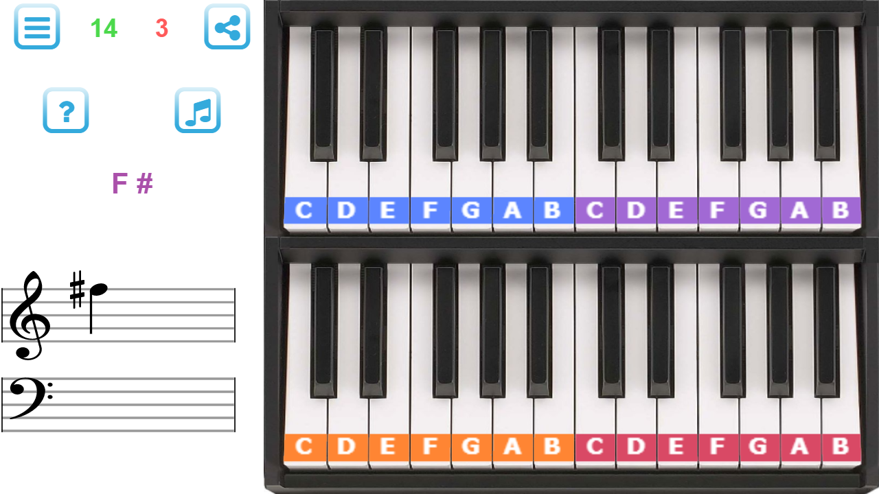 - Help : Possible display of notes placements on the 4 octaves piano keyboard (the name of the note to play is displayed with the same color as the note placement)