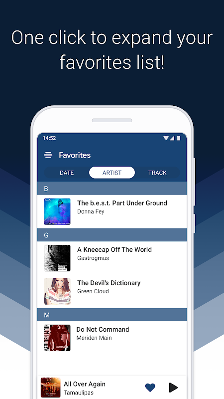 • Easily add tracks to your favourite by simply clicking the «heart» icon.