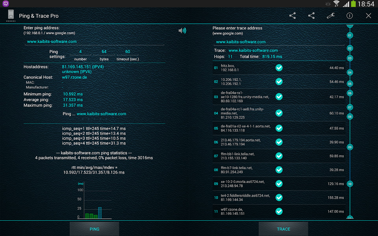 Ping and Trace Pro is a powerful tool to measures the ICMP echo or shows the trace from any host address or host name. For example, www.google.com or 192.168.0.1. The results can quickly be shared (Dropbox, Google Drive, Evernote ...) as a text file (Ping results) or as a .CSV file (Trace results) for e.g. Excel.
