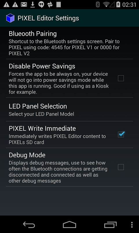 PIXEL Editor is a modified version of the popular Android pixel editor app, Pixelesque, that is integrated with the PIXEL LED hardware display.