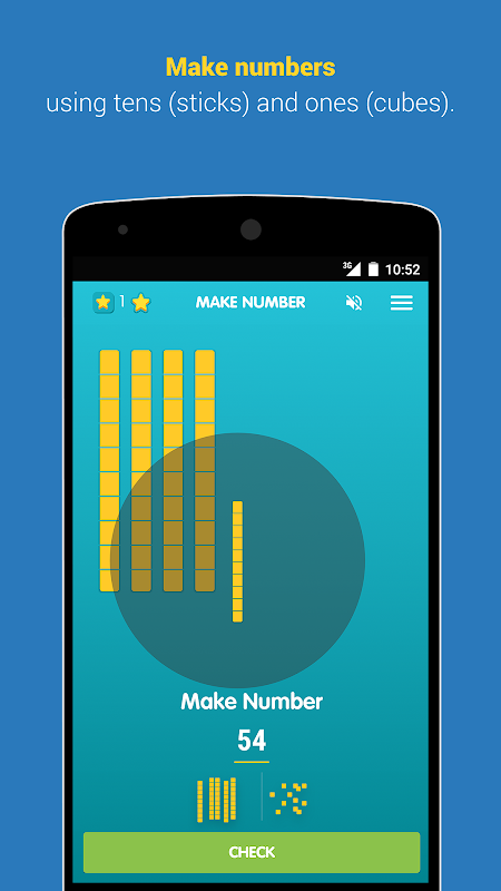 In Make Number, a number is shown, and the child is supposed to make that number using tens (sticks) and ones (cubes). For example, if 68 is shown, the child is supposed to drag 6 sticks and 8 cubes from a pile of sticks and cubes represented at the bottom of the screen.