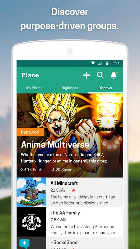 Place’s featured groups include MLBPA's Infield Chatter, Anime Multiverse, AllMineCraft, Creative Rebels, Dragon Ball Xenoverse, Dr. Ornish’s Feel the Love, The AA Family, United Nation’s Plus Social Good, and Travelocity's Gnomads.
