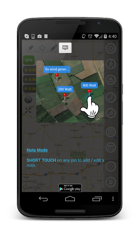 - Lain: ukuran kolam dan ukuran; tiang garis berencana; arah dan navigasi untuk menandai / titik bersama; pelacakan gerakan; mendapatkan koordinat GPS yang tepat dari cara-poin; Perhitungan pagar; mengukur jarak di google maps
