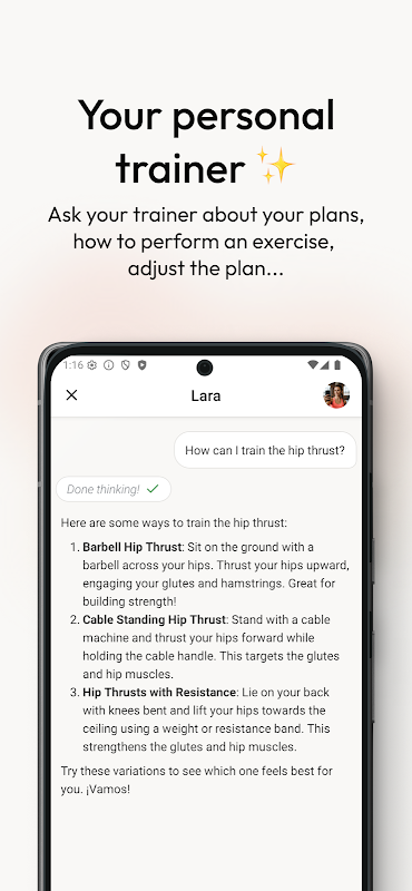 Planor adalah aplikasinya. Lara adalah pelatih pribadi AI Planor yang selalu tersedia. Tetapkan tujuan Anda: membangun kekuatan, membentuk otot, menghilangkan lemak (menurunkan berat badan), meningkatkan mobilitas... serta jadwal dan peralatan yang tersedia. Lara mendengarkan, mengingat masukan Anda, dan memperbarui bobot, repetisi, dan pilihan latihan agar Anda terus berkembang dengan beban progresif.