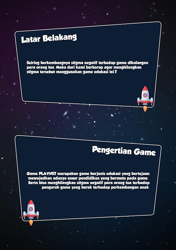 Playnet, salah satu solusi game edukasi untuk anak. Game ini tidak membosankan bagi anak-anak. Bagi remaja maupun orang dewasa juga tidak ada salahnya untuk mencoba game playnet karena di dalam game ini akan memuat beberapa pertanyaan mengenai sistem tata surya khususnya planet kita. Kalian akan di tantang untuk menjawab beberapa pertanyaan yang ada tentang planet tersebut. Dalam game ini, jika salah menjawab maka kalian tidak akan bisa lanjut ke pertanyaan yang selanjutnya. Maka dari itu kalian secara tidak langsung akan belajar materi sistem tata surya, selamat belajar dan menikmati game playnet.