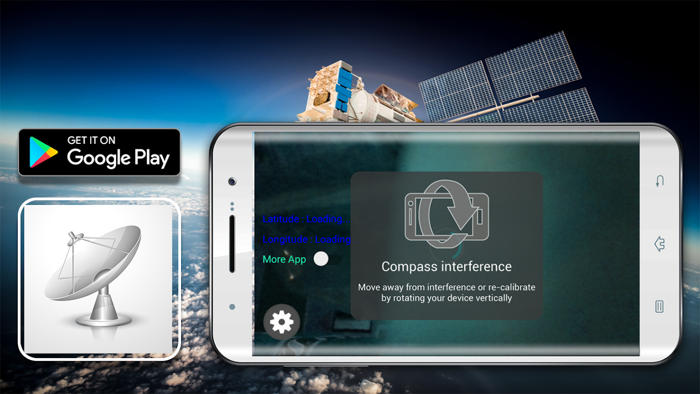 SatFinder (Satellite Finder) satellite finder app is a tool which will help you to set up satellite dish. It will give you azimuth, elevation and LNB tilt for your location (based on GPS) and chosen satellite from list. The result is shown both as numeric data and graphical on google maps. It has also built in compass which will help you to find proper satellite azimuth. It also can use augmented reality to show where is satellite on camera view.