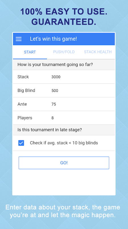 This app works best for No Limit Holdem poker tournaments when there are 7-10 players at your table and the blinds start to get high relative to your stack size (you are a short stack). If you are deep stacked (40+ big blinds) it's better to play "regular" poker. However, once you get short stacked, there is literally no better way than to play push-fold with the use of Poker Hacker.