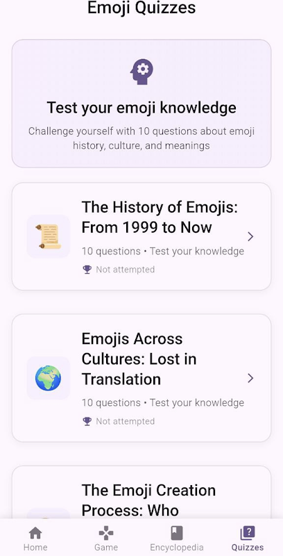 Seberapa baik Anda benar-benar mengenal emoji Anda? Uji pengetahuan Anda dengan empat kuis bertema yang mencakup sejarah, konteks budaya, makna tersembunyi, dan kreasi emoji di pokerstars canada. Setiap kuis berisi pertanyaan yang ditulis dengan cermat dengan umpan balik dan penjelasan instan—sehingga Anda belajar sambil bermain. Lacak skor tertinggi Anda, raih kesempurnaan, dan saksikan keahlian emoji Anda berkembang di setiap percobaan.