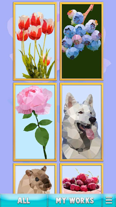 poligon untuk membuat binatang, binatang buas, bunga, atau gambar berwarna lain dan gambar yang indah tersedia. Setiap gambar yang dibuat terlihat seperti model 3D.