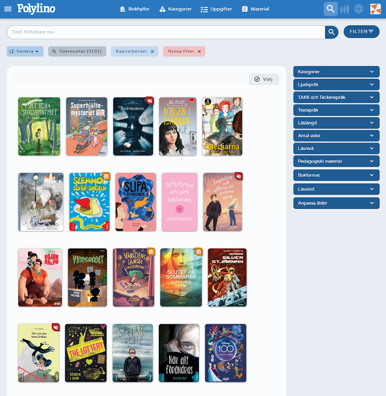 Polylino adalah perpustakaan digital yang menyediakan buku-buku rekaman yang dapat dijelajahi untuk F-9 dan sekolah luar biasa. Mayoritas buku direkam dalam bahasa Swedia dan ada banyak buku dengan audio atau teks dalam bahasa lain, seperti Arab, Inggris, Finlandia, dan Somalia. Ada juga buku dalam TAKK dan bahasa isyarat Swedia, serta deskripsi audio.
