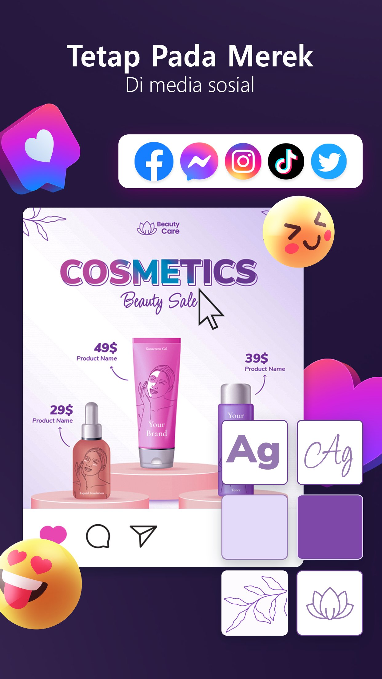 Bagikan spanduk, poster, pamflet Anda yang menakjubkan di saluran media sosial seperti Facebook, Instagram, TikTok, Twitter, WhatsApp untuk berinteraksi dengan audiens Anda dan mendapatkan lebih banyak pelanggan. Hanya dengan beberapa klik, Anda dapat meningkatkan visibilitas merek Anda dan menjangkau khalayak yang lebih luas, sekaligus menampilkan gaya dan pesan unik Anda.