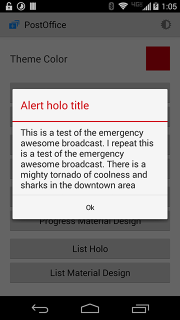 This is the example application of my PostOffice library that lets you easily create Holo or Material Design dialogs in either Light or Dark modes and provides easy customizations and configurations.