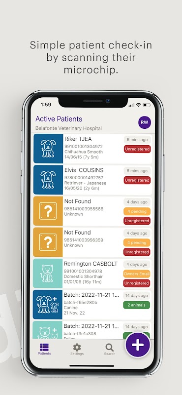 Lihat pasien yang dipindai di aplikasi Vedi. Lihat detailnya dengan mudah, pastikan semuanya benar, dan terdaftar di registri microchip lokal.