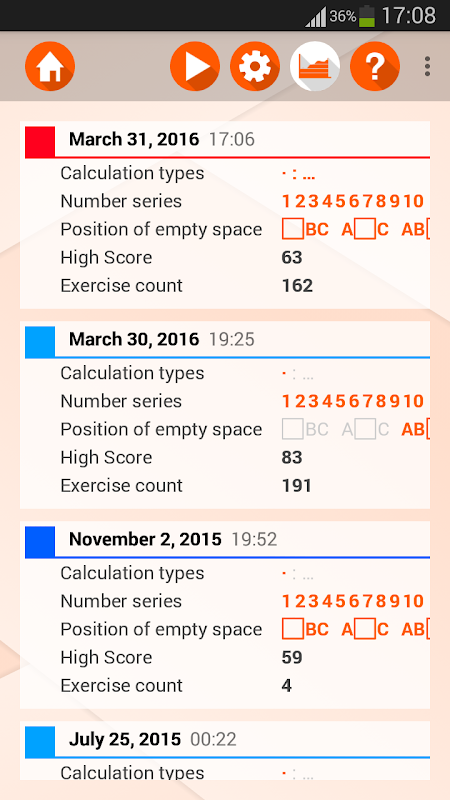 Setelah Anda mengonfigurasi dan mempraktikkan masalah matematika Anda, aplikasi menyimpan skor Anda dan memvisualisasikannya dalam diagram. Dengan diagram ini Anda dapat memeriksa kemajuan belajar Anda.