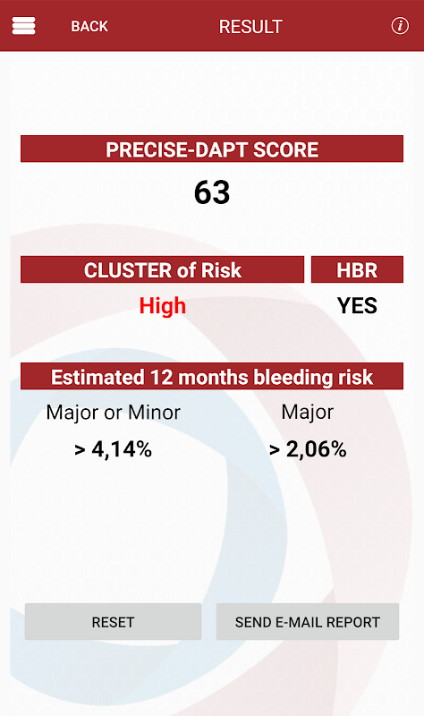 The score has been developed from a collaborative dataset including 14,963 patients from 8 randomized clinical trials, enrolled in more than 130 clinical sites and 12 countries worldwide. The PRECISE-DAPT Risk Score has been externally validated in two independent datasets. The PRECISE-DAPT Score and all related materials are for exclusive use of health care professionals and is intended as a supportive risk assessment tool which should never replace clinical judgment, physician–patient relationship or medical advice. Treatment risks and benefits should always be considered in the context of a comprehensive professional clinical assessment, taking into account all available data and treatment options. Physicians and other healthcare providers should always exercise their own clinical judgment for any given situation.