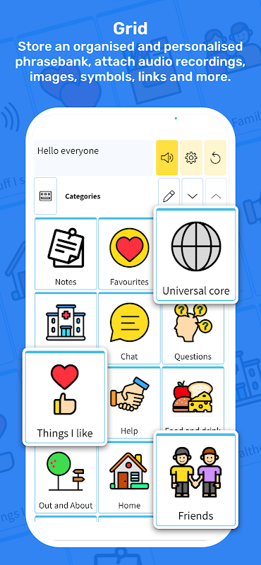Simpan dan atur frasa yang memerlukan akses cepat dalam format kisi sederhana. Sesuaikan lebih lanjut frasa Anda dengan menambahkan simbol, gambar, rekaman audio, tautan, dan lainnya.
