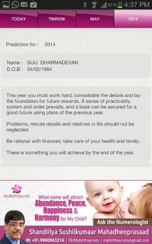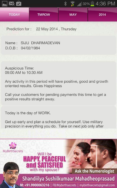 * Important: Only if you notice a text in RED COLOR Box in the first page-"predictions for today"; YOU must consider consulting the numerologist URGENTLY and get the required secret remedies to improve your quality of life.