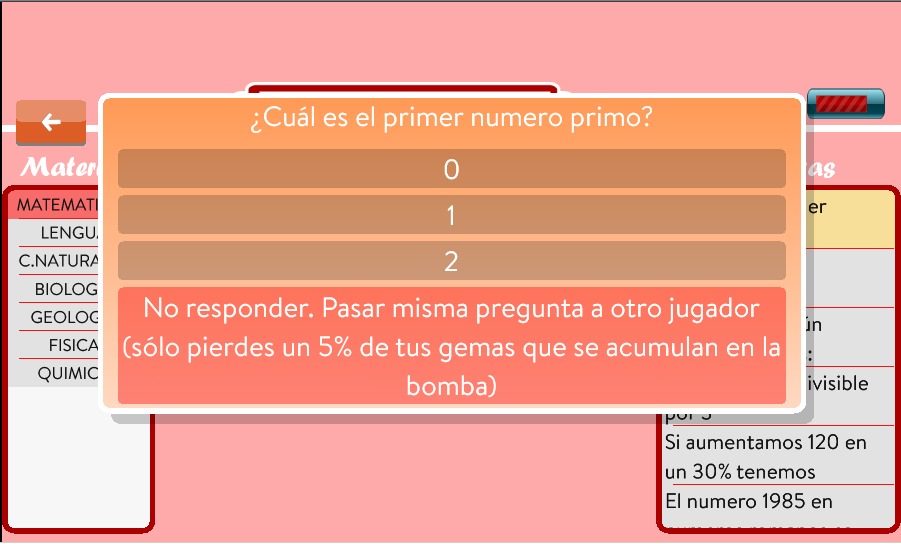♦ Si no contesta pierde el 5% de sus gemas que se acumulan en la bomba y puede pasar la pregunta a otro jugador.