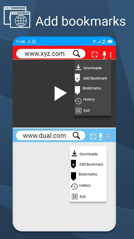 Split Screen-Dual Browser:Fungsi utama lain dari browser ini adalah fungsi dual browser layar terpisah yang berarti Anda dapat membagi layar dalam 2 browser pada ponsel android Anda untuk multitasking atau multi tab. split browser atau split screen view akan meningkatkan multitasking di ponsel Anda. Ini adalah browser sosial terbaik dengan multi tab. browser split-browsing ganda memberi Anda fasilitas untuk membuka dua situs web secara bersamaan seperti membuka media sosial dalam satu layar terpisah dan menonton streaming video apa pun di layar terpisah lainnya. berselancar internet di aplikasi layar ganda ini. ini adalah peramban ganda terbaik untuk menjelajah secara pribadi dan aman. Anda juga dapat memaksimalkan apa pun dari layar browser ganda kapan saja. Anda juga dapat menyimpan riwayat unduhan tontonan dan tanda buku iklan ke layar ganda atau jendela ganda.