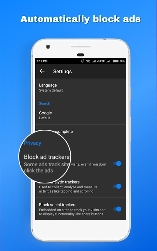 • Blocks a wide range of common Web trackers without any settings to set
