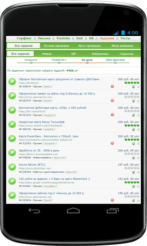 3. Задания. Выполнение заданий – самый высокооплачиваемый способ заработка в интернете. Это может быть написание отзывов и комментариев, клики по рекламе, регистрации с активностью и без и т.д. Чтобы заработать, вам нужно: