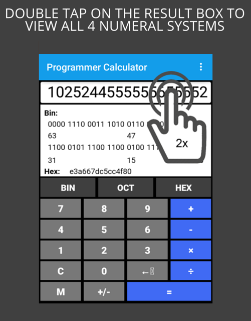 - Untuk melihat semua sistem bilangan tanpa harus mengubah layar sentuh ganda pada kotak hasil, untuk menyembunyikan sistem angka lainnya double tap lagi.