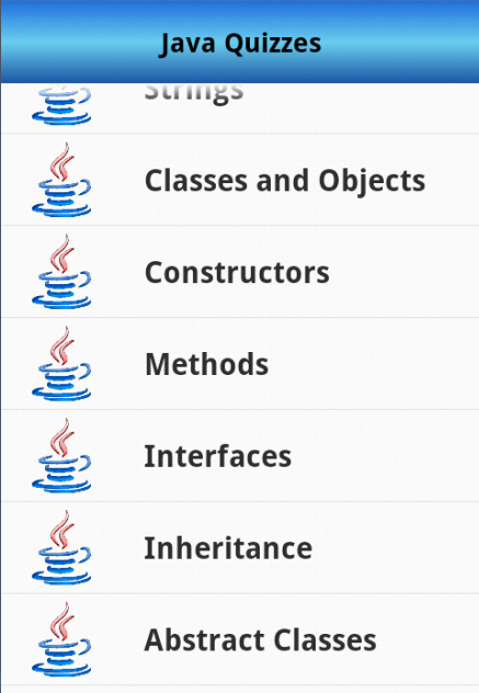 Aplikasi ini memiliki dua kuis bahasa utama. Java dan C #. Pertanyaan-pertanyaan dikelompokkan dalam beberapa kategori, sehingga Anda dapat mencoba kuis setelah menyelesaikan sebuah bab dari buku atau materi pelajaran.