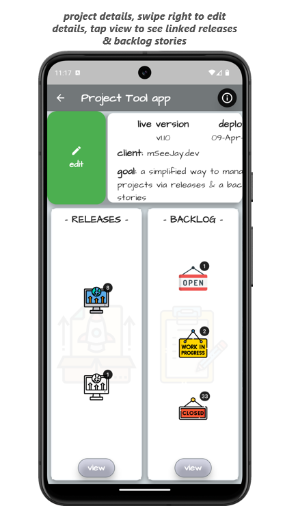 Geser entri yang ada ke kanan untuk mengedit detail yang telah dimasukkan sebelumnya atau untuk melihat proyek. Geser ke kiri untuk menghapus proyek dan semua rilis & backlog cerita terkait.