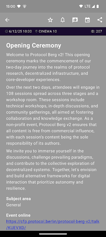 💡 Pertanyaan mengenai konten hanya dapat dijawab oleh tim konten Protocol Berg. Aplikasi ini hanya menawarkan cara untuk menggunakan dan mempersonalisasi jadwal konferensi.