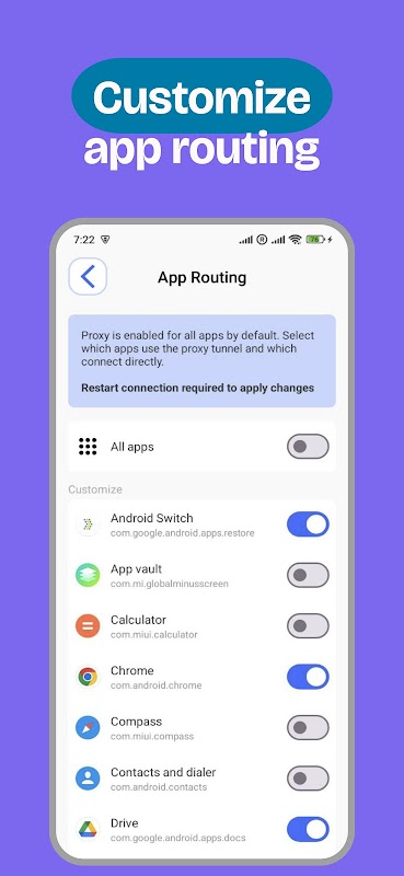 Buka blokir aplikasi populer, lindungi privasi Anda, dan tentukan aplikasi mana yang menggunakan proxy dan mana yang terhubung langsung.