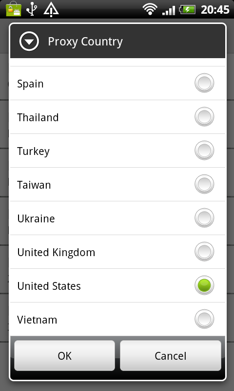 Sebagai contoh, ketika Anda perlu surfing internet atau menggunakan aplikasi melalui proxy USA, cukup pilih Unite Serikat di negara proxy dan klik "mengambil proxy". Ini kemudian akan mengambil dan mengkonfigurasi proxy bekerja di telepon.