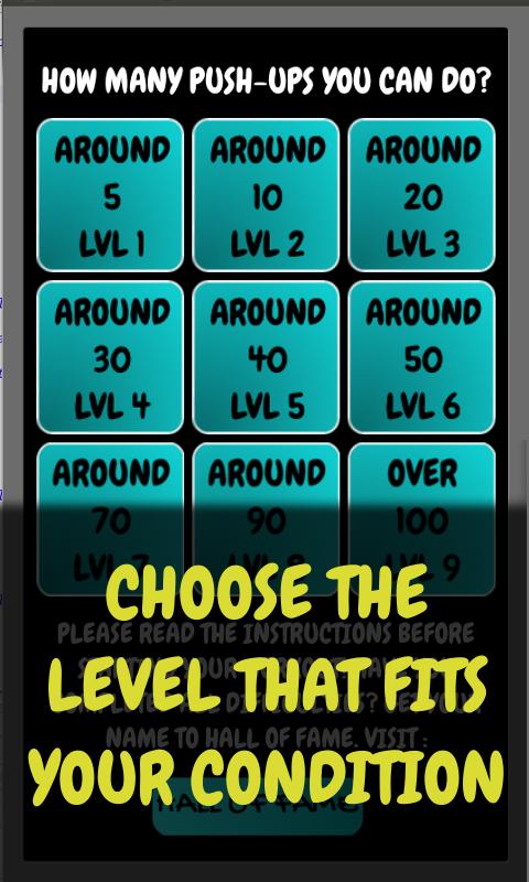 Push up has 6 different difficulty levels from beginner to more advanced trainer. After you have completed one difficulty you should be strong enough to move to the next one. After completing the hardest difficulty you should be able to do 100 pushups .