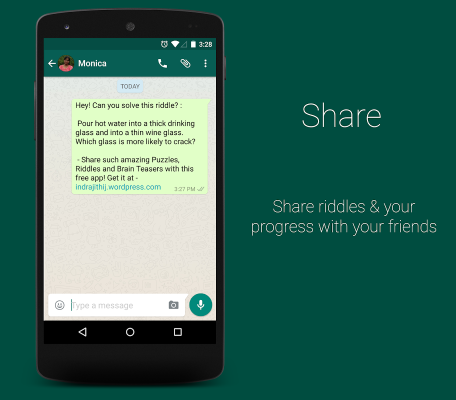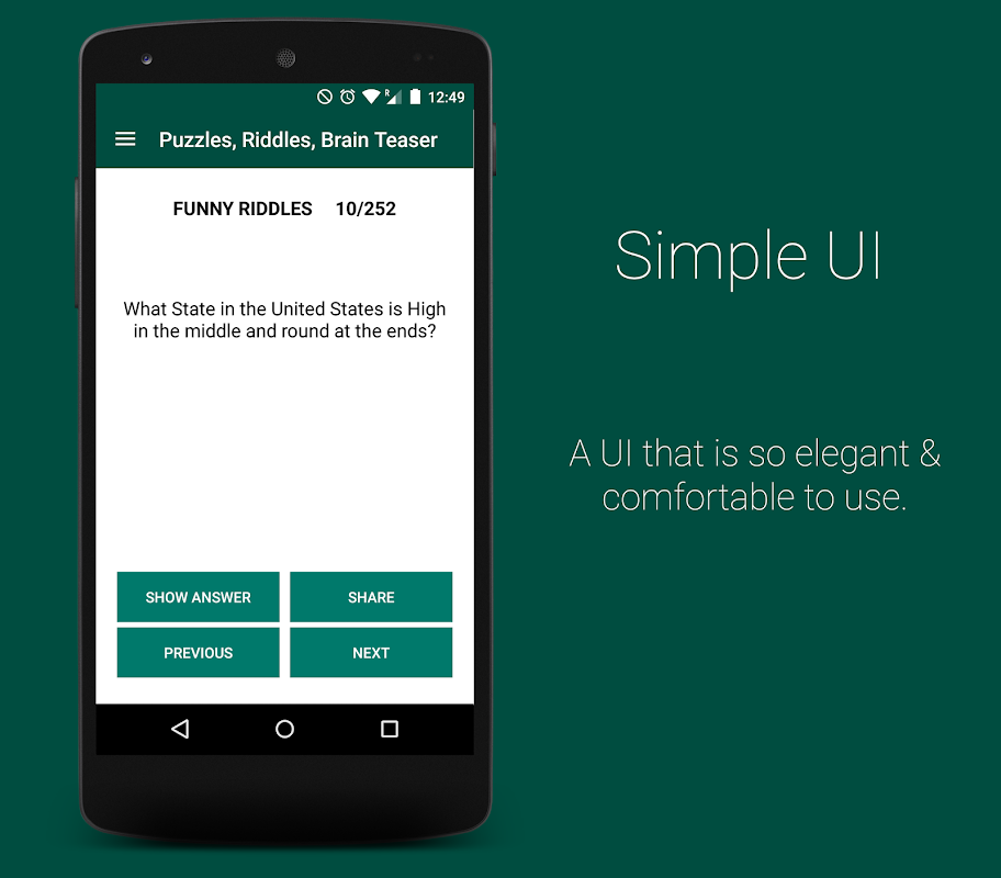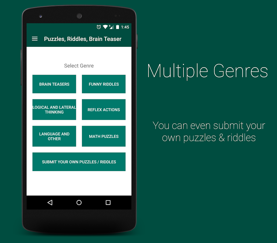 With puzzles, riddles and brain teasers all in one place, this game is one's best time-pass. It has over 500 riddles & puzzles in over 6 genres, all at one place! give your brain some work. Give it some riddles & puzzles to solve. Share a riddle or your progress with your friend. You can even challenge your friend to answer a particular question or an entire genre.! Besides, the flexibility of the app's layout using the Material Design paves way for it to flow across various screen sizes in a more fluid manner.