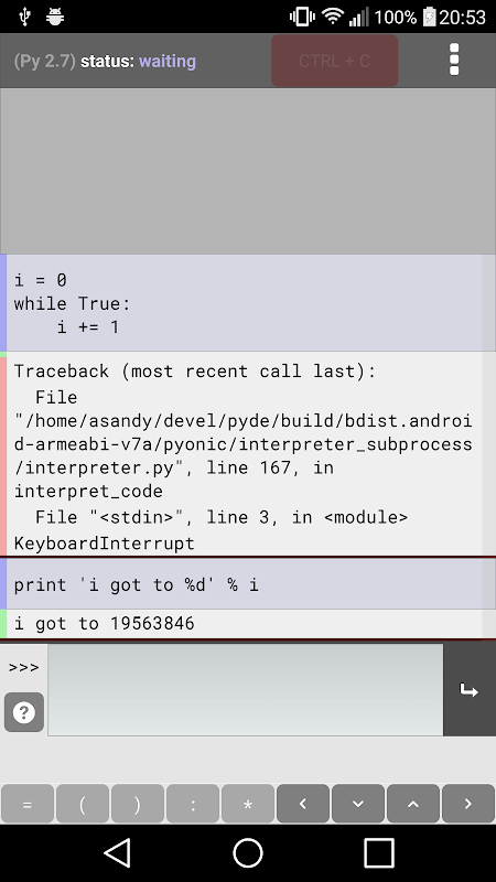Sebuah Python 2 antarmuka interpreter, ditulis dengan Python menggunakan Kivy.