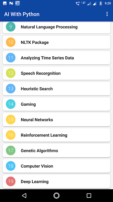 Artificial intelligence is the intelligence demonstrated by machines, in contrast to the intelligence displayed by humans. This app covers the basic concepts of various fields of artificial intelligence like Artificial Neural Networks, Natural Language Processing, Machine Learning, Deep Learning, Genetic algorithms etc., and its implementation in Python.