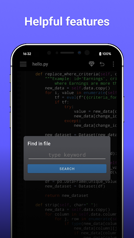 Jelajahi dunia penuh kemungkinan dengan fitur pengeditan ekstensif. Python Mobile - IDE menyediakan seperangkat alat canggih untuk meningkatkan pengalaman coding Anda, memastikan Anda dapat mengedit kode dengan presisi dan mudah.