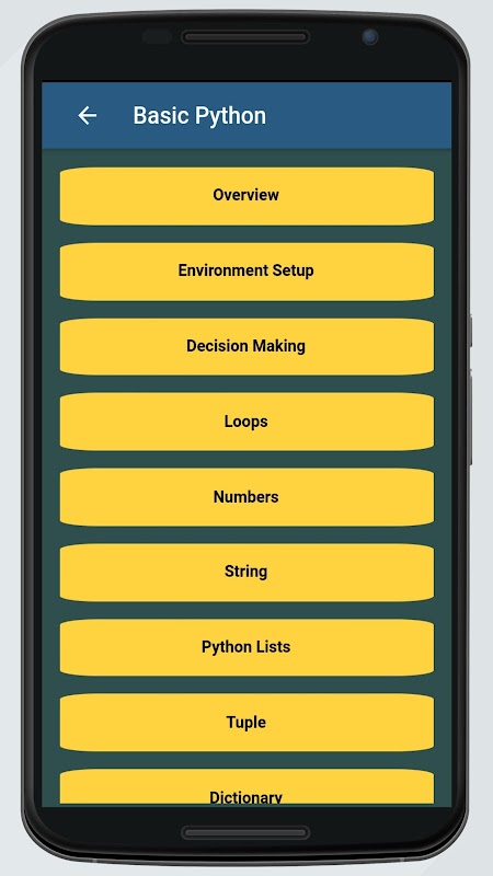 Tutorial dalam aplikasi dibagi menjadi beberapa bagian yang komprehensif untuk mudah dan cepat belajar. Tidak ada pengalaman pemrograman sebelumnya diperlukan bahkan pemula bisa belajar Python dengan mudah.